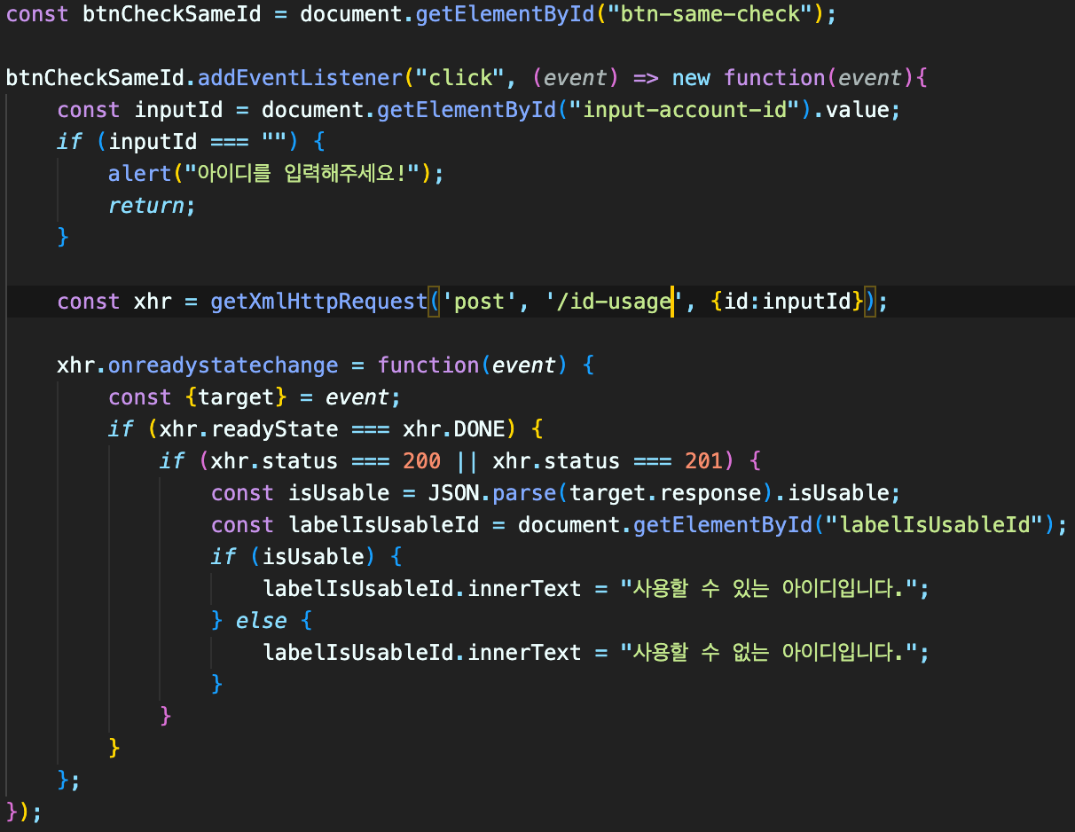 다음으로 아이디 중복 여부 확인 기능인데, 위 코드는 XmlHttpRequest를 사용하기 위해 method, uri, post할 data를 받아 비동기 송수신을 할 수 있도록 만든 함수이다.
