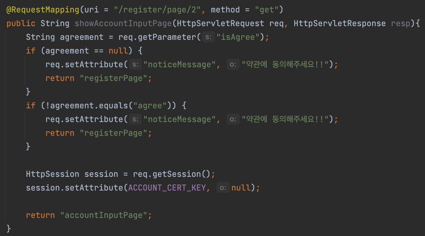 위 사진은 약관 동의 페이지에서 다음 단계로 이동 버튼을 클릭했을 때 실행되는 컨트롤러의 코드이다.