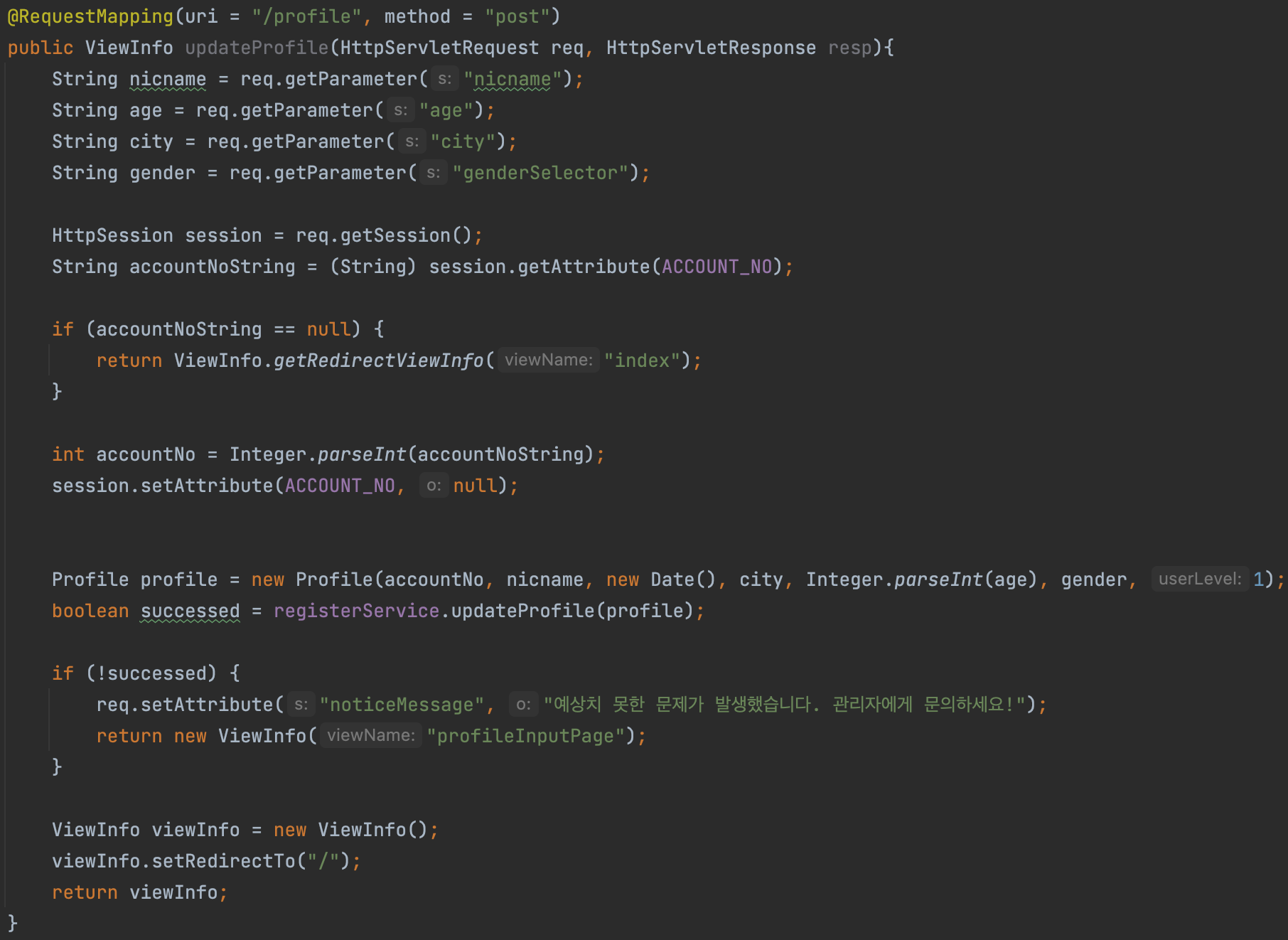 위 사진은 Profile을 작성하고 적용하기 버튼을 클릭했을 시 서버에서 실행되는 컨트롤러의 코드이다. 코드가 진행되는 순서는 아래와 같다.