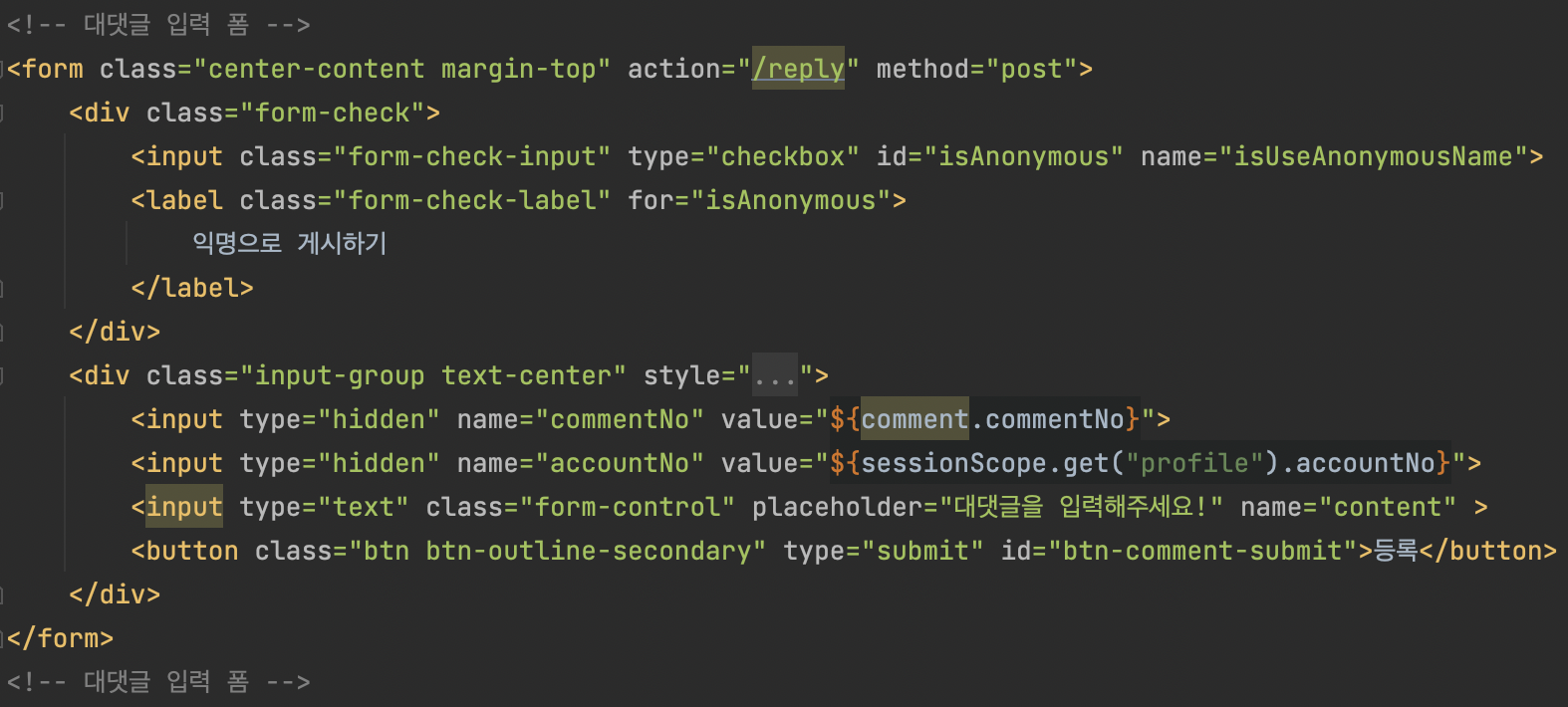 대댓글 목록의 하단에 대댓글을 입력할 수 있도록 폼을 만들었고 코드 설명은 다음과 같다.